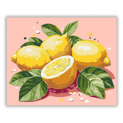 Citromok Rózsaszín Háttéren - számfestő készlet – 40×50 cm (Keret nélkül) A kép élénk sárga citromokat ábrázol zöld levelekkel egy korall-rózsaszín háttéren. A színek kontrasztja friss és vidám hangulatot kelt. A kompozíció energikus és üde érzetet közvet