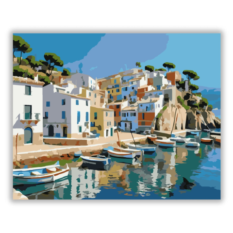 Costa Brava Halászfalva - számfestő készlet – 40×50 cm (Keret nélkül) A festmény egy nyugodt halászfalut ábrázol a Costa Braván, fehérre meszelt házakkal és színes csónakokkal a kikötőben. A kép ragyogó kék ég és a tenger színei által teremtett friss, med