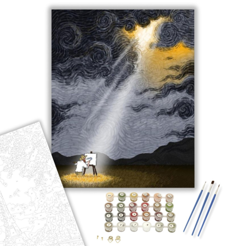 Cseppnyi napsugár - számfestő készlet – 40×50 cm (Keretre feszítve) A kép misztikus hangulatot áraszt, mintha egy varázslatos pillanatot örökítene meg a természet és az ember találkozásáról. Egy festő áll a vászna előtt, miközben a sötét égbolton áttörő f