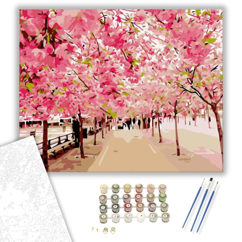 Cseresznye Virágok - számfestő készlet – 40×50 cm (Keretre feszítve) A festmény megnyugtató tavaszi hangulatot áraszt, ahol a cseresznyevirágok rózsaszínje szinte életre kel. Egy romantikus sétány képe rajzolódik ki, amelyen az ember szívesen andalogna eg