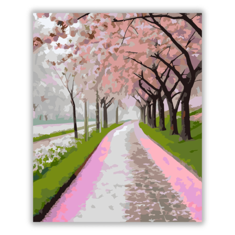 Cseresznyevirágok Tavaszi Sétaút - számfestő készlet – 40×50 cm (Keret nélkül) A festmény egy romantikus sétányt ábrázol, amelyet teljes virágzásban lévő cseresznyefák szegélyeznek, rózsaszín szirmokkal borítva az utat. Az élénk rózsaszín és zöld színek f