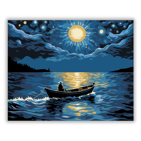 Csillagfényes Evezés - számfestő készlet – 40×50 cm (Keret nélkül) A képen egy csónakos alak látható, amint a csillagfényes éjszakában evez a vízen, a Van Gogh stílusára jellemző elemekkel. Az éjszakai égbolt élénk kék és sárga színek kontrasztjával kel é