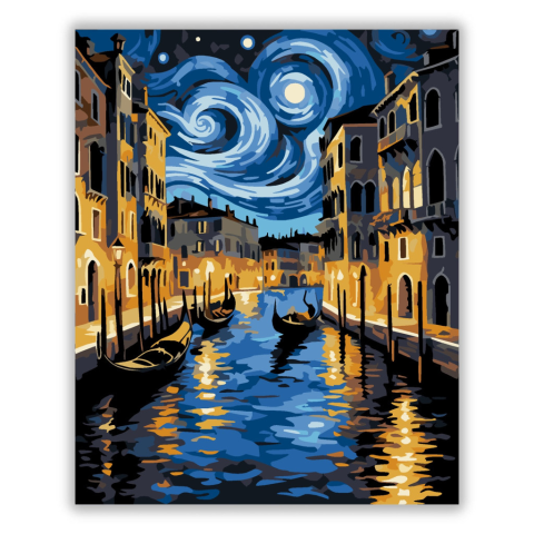 Csillagfényes Velencei Álmok - számfestő készlet – 40×50 cm (Keret nélkül) Ez a festmény a velencei csatornák éjszakai báját örökíti meg, lenyűgöző művészi stílusban. Az éjszakai égbolt örvénylő csillagai és a víz tükröződései gazdag kék és arany színekke