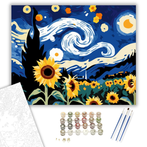 1 kép Számfestő.hu Csillagos Napraforgó Éjszaka - számfestő készlet – 40×50 cm (Keretre feszítve)