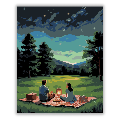 Csillagos Nyári Éj a Réten - számfestő készlet – 40×50 cm (Keret nélkül) A festmény egy csillagos nyári éjszakát ábrázol, ahol egy pár piknik takarón ül, miközben tűzbogarak villódznak a rét felett. Az égbolt mélykék és arany árnyalatokkal ragyog, a meleg