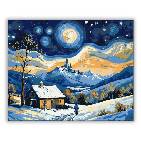 Csillagos Téli Éj - számfestő készlet – 40×50 cm (Keret nélkül) Egy magányos házikó áll a hófedte domboldalon, miközben a távolban egy mesebeli kastély emelkedik a hegycsúcson. Az égbolt csodás kék és arany viharvert hullámai ragyognak, mint a téli éj csi