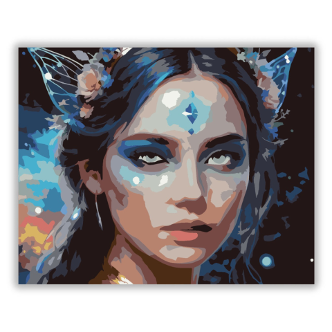 Csillagpor Tündér - számfestő készlet – 40×50 cm (Keret nélkül) A festmény egy csillagpor tündért ábrázol, aki áttetsző szárnyakkal és galaxissal teli szemekkel ragyog a sötét háttér előtt. A kék és lila árnyalatok varázslatos, éteri hangulatot teremtenek
