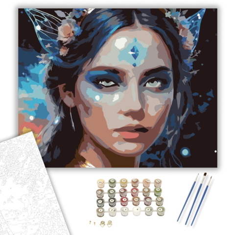 Csillagpor Tündér - számfestő készlet – 40×50 cm (Keretre feszítve) A festmény egy csillagpor tündért ábrázol, aki áttetsző szárnyakkal és galaxissal teli szemekkel ragyog a sötét háttér előtt. A kék és lila árnyalatok varázslatos, éteri hangulatot teremt