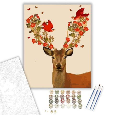 Csodálatos Szarvas - számfestő készlet – 40×50 cm (Keretre feszítve) Ez a festmény egy varázslatos világba repít, ahol az állatok és a természet harmóniában élnek. A kép egy szarvast ábrázol, melynek agancsai virágokkal és madarakkal teli, mintha a termés