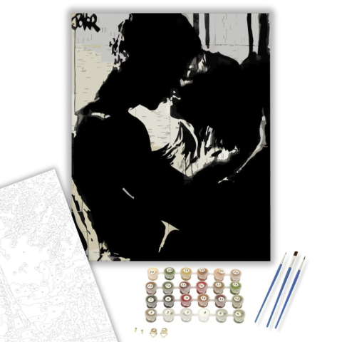 Csók - számfestő készlet – 40×50 cm (Keretre feszítve) A festmény mély érzelmeket és intimitást sugároz, mintha a néző egy titkos pillanat tanúja lenne. Egy rejtélyes történet bontakozik ki két alak között, akik egymás felé hajolnak, mintha a világ megszű