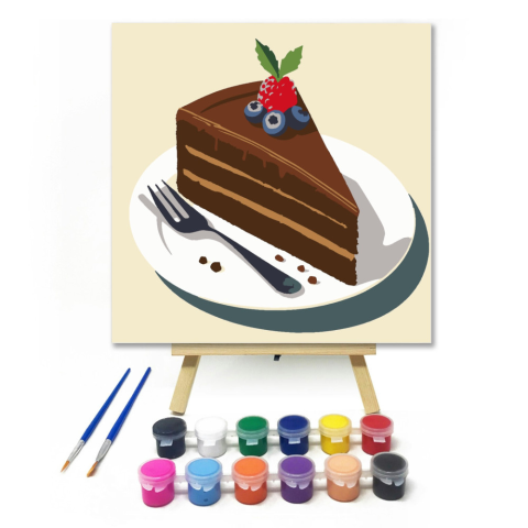 Csokoládés álom - gyerek számfestő készlet – 20×20 cm (Keretre feszítve) Ez a kép egy finom csokoládétortát ábrázol, amelyen friss gyümölcsök ülnek, készen arra, hogy megédesítsék a napodat. A gazdag barna és piros árnyalatok vidám hangulatot varázsolnak