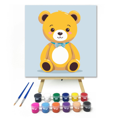 Csokornyakkendős mackó - gyerek számfestő készlet – 20×20 cm (Keretre feszítve) Íme egy kedves kis mackó, aki büszkén viseli csinos csokornyakkendőjét! A meleg sárga és kék színek vidám hangulatot árasztanak, tökéletes választás a gyerekek kreatív kalandj