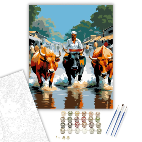 Dél-Indiai Bikamosás Fesztivál - számfestő készlet – 40×50 cm (Keretre feszítve) A festmény egy dél-indiai falusi jelenetet ábrázol a bikamosás fesztivál idején, ahol fiatalok vizet locsolnak a folyóban álló, gazdagon feldíszített bikákra. Az élénk színek