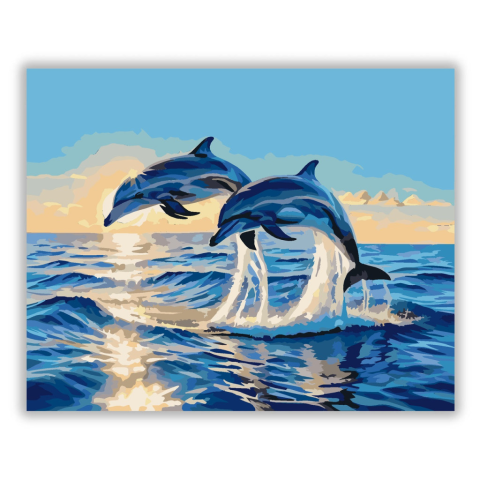 Delfinek a Naplementében - számfestő készlet – 40×50 cm (Keret nélkül) A festmény két delfint ábrázol, amint játékosan ugranak a csillogó kék víz fölött, a naplemente aranyló fényében. A kép élénk kék és arany színekben pompázik, vidám és élettel teli han