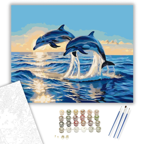 Delfinek a Naplementében - számfestő készlet – 40×50 cm (Keretre feszítve) A festmény két delfint ábrázol, amint játékosan ugranak a csillogó kék víz fölött, a naplemente aranyló fényében. A kép élénk kék és arany színekben pompázik, vidám és élettel teli