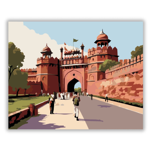 Delhi Vörös Erőd - számfestő készlet – 40×50 cm (Keret nélkül) A festmény a Delhi Vörös Erőd grandiózus falait és kapuit ábrázolja, indiai zászlóval a háttérben. A meleg vörös és barna árnyalatok dinamikus kontrasztot alkotnak a kék éggel, barátságos és m