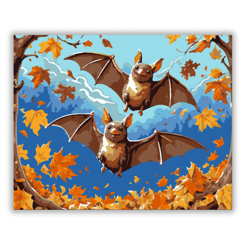 Denevérek az őszi erdőben - számfestő készlet – 40×50 cm (Keret nélkül) Ez a festmény két vidám denevért ábrázol, amint az őszi erdő levelei között repkednek. A levegőben kavargó narancssárga és sárga levelek tökéletesen harmonizálnak az ég kékes árnyalat