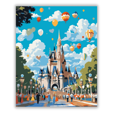 Disney World Vidám Nap - számfestő készlet – 40×50 cm (Keret nélkül) A festmény a floridai Disney World bejáratát ábrázolja, háttérben a mesebeli Hamupipőke kastéllyal és látogatókkal, akik lufik alatt sétálnak. A színvilág élénk, derűs kék és zöld árnyal