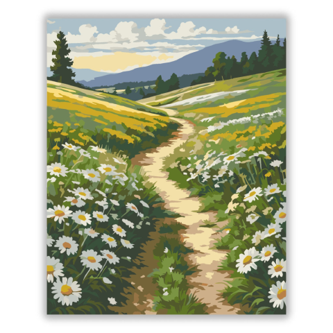 Domboldali Margaréták - számfestő készlet – 40×50 cm (Keret nélkül) A festmény egy napsütötte mezőt ábrázol, tele fehér és sárga margarétákkal, melyeken egy keskeny földút kanyarog a távoli domb felé. A virágok kontrasztos színei friss és vidám hangulatot