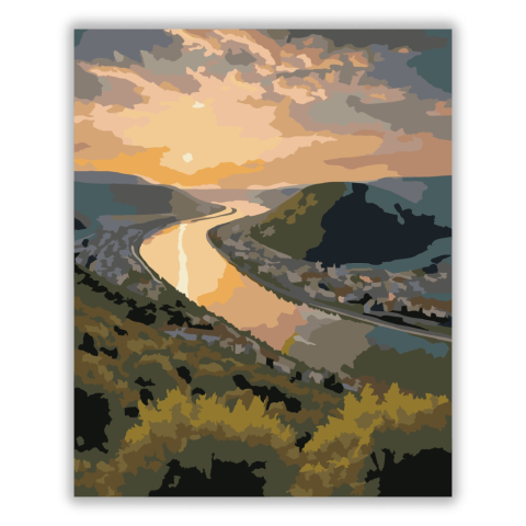 Dunakanyar Naplementében - számfestő készlet – 40×50 cm (Keret nélkül) A festmény a Dunakanyart ábrázolja naplementekor, gyönyörű aranyló fénnyel a folyón és a környező dombokon. A színvilág meleg arany és zöld árnyalatokat használ, amelyek békés és idill