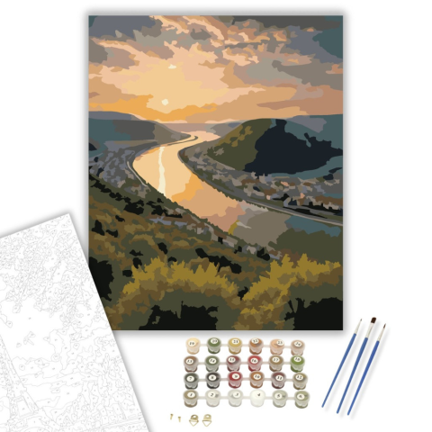Dunakanyar Naplementében - számfestő készlet – 40×50 cm (Keretre feszítve) A festmény a Dunakanyart ábrázolja naplementekor, gyönyörű aranyló fénnyel a folyón és a környező dombokon. A színvilág meleg arany és zöld árnyalatokat használ, amelyek békés és i