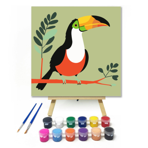 Dzsungel királya - gyerek számfestő készlet – 20×20 cm (Keretre feszítve) Ez a kép egy vidám tukánt ábrázol, aki büszkén ül egy ágon a dzsungelben. A színes tollai és a zöld levelek igazán életre keltik a dzsungel hangulatát. Tökéletes választás minden ki