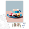 Édes Kávé Pillanatok - számfestő készlet – 40×50 cm (Keret nélkül) A kép egy csésze kávét és három színes macaront ábrázol minimalista stílusban, letisztult vonalakkal. A pasztell színek harmóniája és az egyszerű formák kiemelik a kompozíció eleganciáját.
