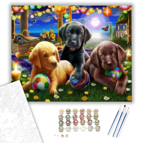Édes kutyák - számfestő készlet – 40×50 cm (Keretre feszítve) A festmény vidám, játékos hangulatot áraszt, amely azonnal mosolyt csal a néző arcára. Egy varázslatos kertben játszódik a történet, ahol a kutyák boldogan pihennek és élvezik az esti fényeket.
