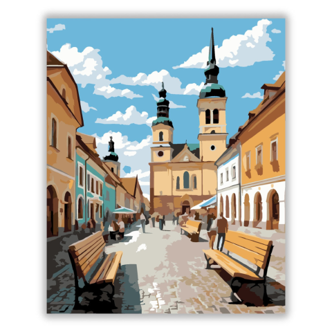 Eger Főtere a Minorita Templommal - számfestő készlet – 40×50 cm (Keret nélkül) A festmény Eger főterét ábrázolja, középpontban a Minorita templommal, macskaköves utcákkal és fagyizó emberekkel. A világos kék ég és a napfényes épületek barátságos, vidám h