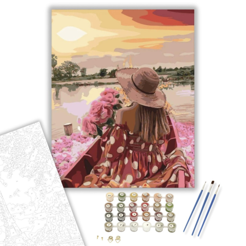 Egyedül a naplementében - számfestő készlet – 40×50 cm (Keretre feszítve) A festmény csendes nyugalmat áraszt, miközben a nézőt egy varázslatos naplemente pillanatába repíti. Egy női alak ül egy csónakban, rózsákkal körülvéve, mintha egy romantikus történ