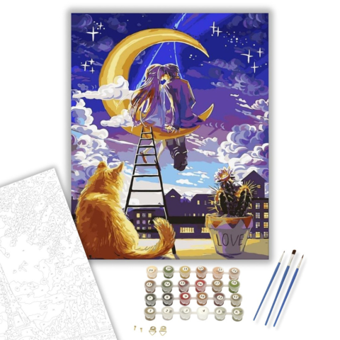 Együtt a háztetőn - számfestő készlet – 40×50 cm (Keretre feszítve) Ez a festmény varázslatos éjszakai hangulatot áraszt, ahol a csillagok és a hold romantikus találkozásra hívják a nézőt. Egy álomszerű történet bontakozik ki, ahol az égi jelenségek és az