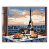 Eiffel-torony és Párizsi Kávézó - számfestő készlet – 40×50 cm (Keret nélkül) A festmény az Eiffel-torony látványát ábrázolja egy párizsi kávézó teraszáról, ahol borospoharak és gyertyafény díszíti az asztalt. A háttérben a naplemente meleg narancs és kék
