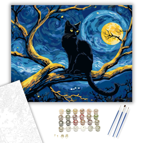 Éjféli Macska Meséje - számfestő készlet – 40×50 cm (Keretre feszítve) A festmény egy titokzatos fekete macskát ábrázol, amely egy örvénylő éjszakai égbolt alatt ül egy ágon. Az élénk kék és mély sárga árnyalatok, valamint a lendületes ecsetvonások dinami