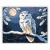 Éjjeli Bagoly Harmóniája - számfestő készlet – 40×50 cm (Keret nélkül) A képen egy varázslatos, hófehér bagoly pihen egy vastag ágon, miközben a téli éjszaka csendjében a telihold ragyogása öleli körül. A háttérben a kék éjszaka és a hóborította ágak mege