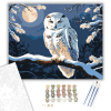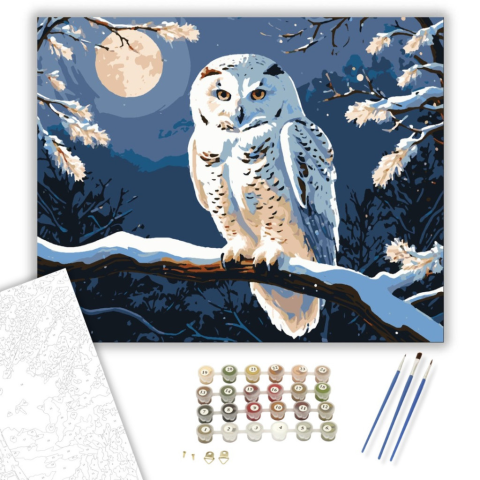 Éjjeli Bagoly Harmóniája - számfestő készlet – 40×50 cm (Keretre feszítve) A képen egy varázslatos, hófehér bagoly pihen egy vastag ágon, miközben a téli éjszaka csendjében a telihold ragyogása öleli körül. A háttérben a kék éjszaka és a hóborította ágak