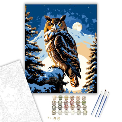 Éjjeli Bagoly Varázslat - számfestő készlet – 40×50 cm (Keretre feszítve) A festményen egy impozáns bagoly pihen az ágakon, miközben a telihold fénye körvonalazza alakját. A háttérben hóval borított fenyők kísérik a misztikus éjszaka sötétjét, amelyet az