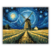 Éjjeli Szélmalom Harmóniája - számfestő készlet – 40×50 cm (Keret nélkül) A festmény egy szélmalmot ábrázol, amelyet a csillagos éjszaka varázslatos fénye vesz körül, Van Gogh stílusában. Az élénk sárga és kék színek kontrasztja, valamint a dinamikus ecse