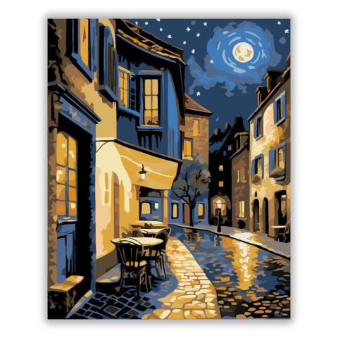 Éjjeli Utcák Varázsa - számfestő készlet – 40×50 cm (Keret nélkül) A festmény egy hangulatos, éjszakai utcai jelenetet ábrázol, Van Gogh inspirálta művészi stílusban. Az élénk kék és arany színek dinamikus ecsetvonásokkal keverednek, különleges atmoszférá