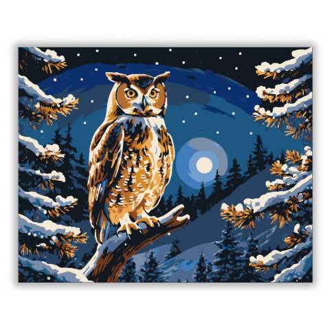 Éjszakai Bagoly Harmóniája - számfestő készlet – 40×50 cm (Keret nélkül) Az éjszaka csöndjében egy bölcs bagoly ül egy hóval borított ágon, figyelve az alatta elterülő erdőt. A kép hátterében a mélykék égbolton ragyogó hold világítja meg a tájat, miközben