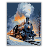 Éjszakai Expressz Varazslat - számfestő készlet – 40×50 cm (Keret nélkül) A kép közepén egy füstöt eregető, elegáns régi gőzmozdony suhan át a hófödte tájon, egy mesés éjszakán. A háttérben az égbolt sötétkék árnyalatai kontrasztálnak a narancsszínű füst