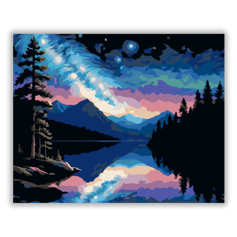 Éjszakai Hegyi Tó és Spirálgalaxis - számfestő készlet – 40×50 cm (Keret nélkül) A festmény egy békés hegyi tavat ábrázol éjszaka, amelynek nyugodt vize egy fényes spirálgalaxist tükröz vissza a csillagos égen. A kék, lila és rózsaszín árnyalatok varázsla