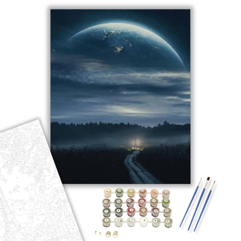 Éjszakai kilátás - számfestő készlet – 40×50 cm (Keretre feszítve) Ez a festmény misztikus és nyugodt hangulatot áraszt, mintha egy másik világba kalauzolna. Egy távoli utazás történetét sugallja, ahol a természet és az univerzum találkozik. A mélykék árn