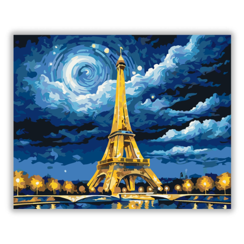 Éjszakai Torony Fényei - számfestő készlet – 40×50 cm (Keret nélkül) A festmény varázslatos éji látványt tár elénk, ahol az Eiffel-torony ragyogó fényei emelkednek ki a csillagos égbolt alatt. Az élénk kék és arany színek kontrasztja, valamint a dinamikus