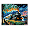 Éjszakai Vonat Lendülete - számfestő készlet – 40×50 cm (Keret nélkül) A kép egy száguldó vonatot ábrázol, amely a csillagos éjszaka alatt robog át a tájon, különleges művészi interpretációban. Az élénk színek és dinamikus ecsetvonások az expresszív stílu
