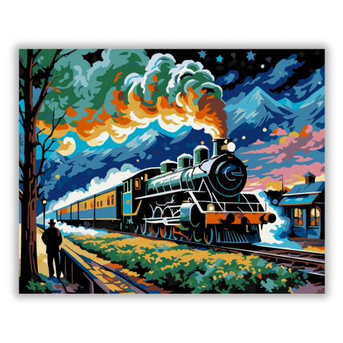 Éjszakai Vonat Lendülete - számfestő készlet – 40×50 cm (Keret nélkül) A kép egy száguldó vonatot ábrázol, amely a csillagos éjszaka alatt robog át a tájon, különleges művészi interpretációban. Az élénk színek és dinamikus ecsetvonások az expresszív stílu