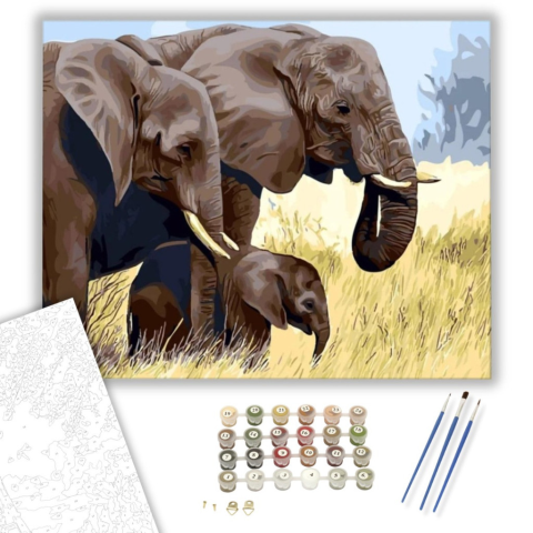 Elefánt család - számfestő készlet – 40×50 cm (Keretre feszítve) A festmény békés nyugalmat sugároz, ahogy az elefánt család a szavanna aranyló fűjében vonul. A kép mögött rejlő történet az összetartozás és a természet harmóniájának szépségét meséli el. A