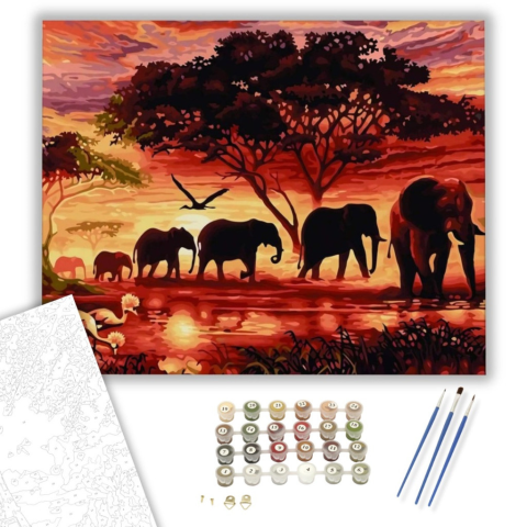 Elefántok a szavannán - számfestő készlet – 40×50 cm (Keretre feszítve) A naplemente meleg fényei által átitatott festmény békés nyugalmat áraszt. A sziluettek mögött kibontakozó történet az elefántok lassú, méltóságteljes vonulását meséli el. A vörös és
