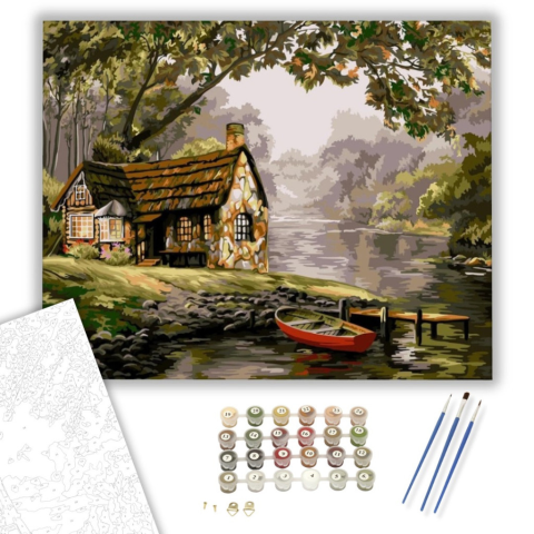 Elhagyatott ház - számfestő készlet – 40×50 cm (Keretre feszítve) A festmény nyugalmat és meghittséget áraszt, mintha egy elfeledett mesevilágba kalauzolna. Egy kis ház mellett megbúvó csónak mesél a csendes reggelekről és a titkokat rejtő vizekről. A zöl