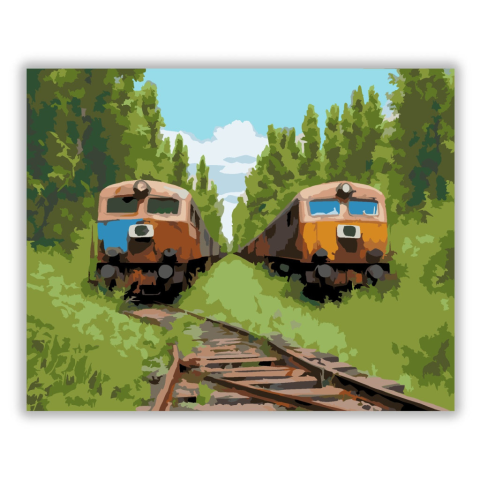 Elhagyatott Tehervonatok Természetben - számfestő készlet – 40×50 cm (Keret nélkül) A festmény két rozsdás tehervonatot ábrázol, amelyek elhagyatottan pihennek a benőtt síneken. A képen dominálnak a zöld növények és a kék ég, ami nyugodt, mégis nosztalgik