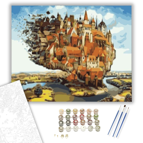Eltűnő Város - számfestő készlet – 40×50 cm (Keretre feszítve) A kép egy misztikus, lebegő várost ábrázol, amely a nézőt az álmok világába repíti. A város részletei és a háttér sejtelmes történetet mesélnek egy eltűnő világról. A meleg narancs és barna ár